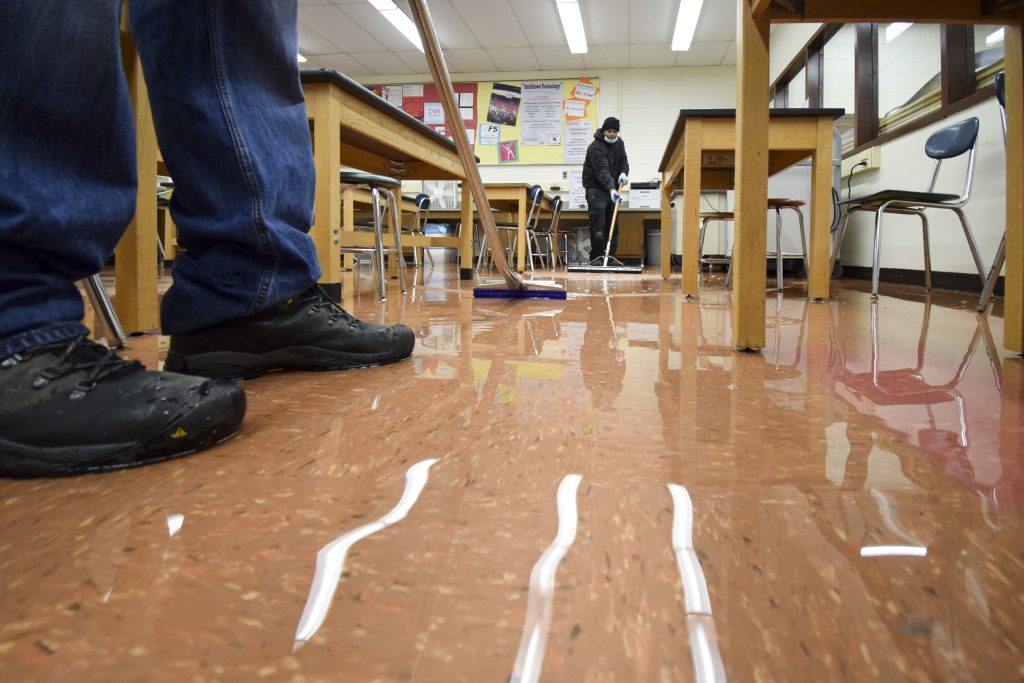 A large area of damage was located in a second-floor classroom where a sink pipe froze and cracked resulting in floor damage to three surrounding classrooms. This destruction was considerable. Water flowed out and down through the storage room ceiling beneath the classroom where two inches of water flooded the area. This build up seeped into the hallway and down to the elevator pit filling that space with another inch of water. RENU’s team set up water extractors in all these areas and utilized the pump truck to drain out the flooded areas.