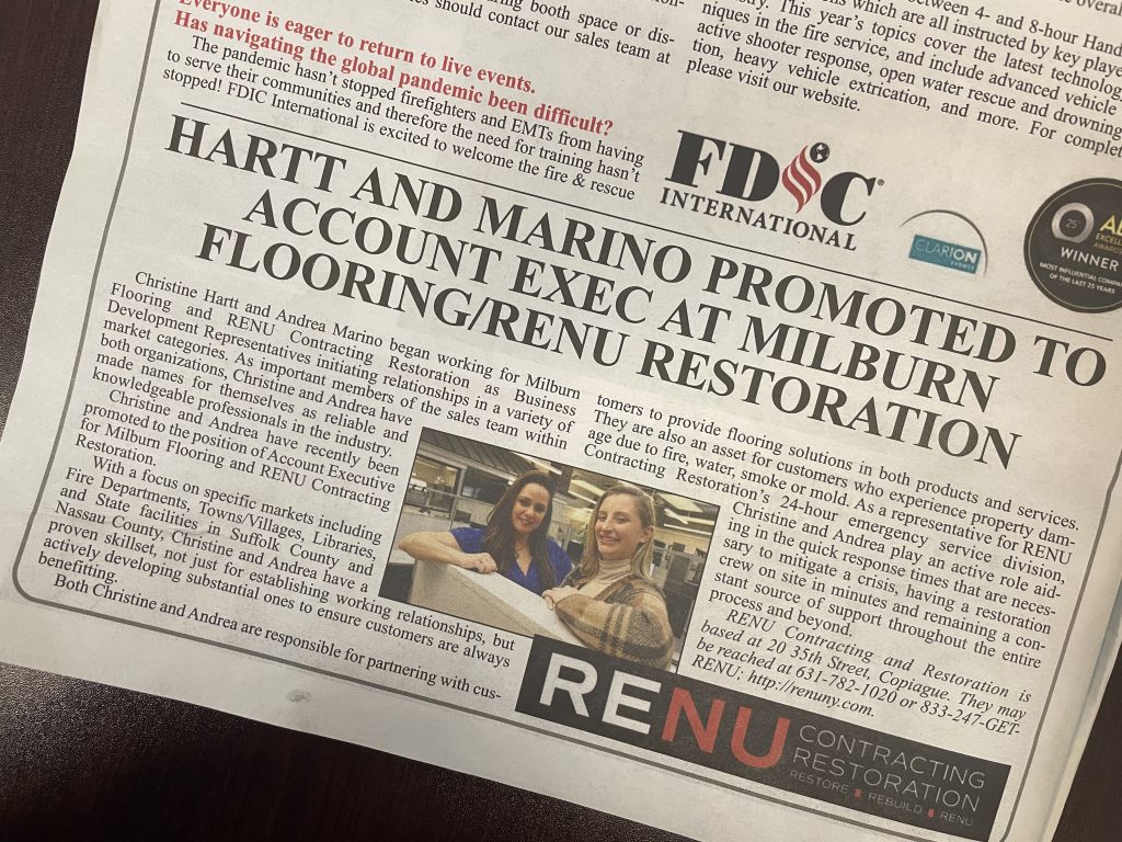 “Christine Hartt and Andrea Marino began working for Milburn Flooring and RENU Contracting Restoration as Business Development Specialists initiating relationships in a variety of market categories. As important members of the sales team within both organizations, Christine and Andrea have made names for themselves as reliable and knowledgeable professionals in the industry.