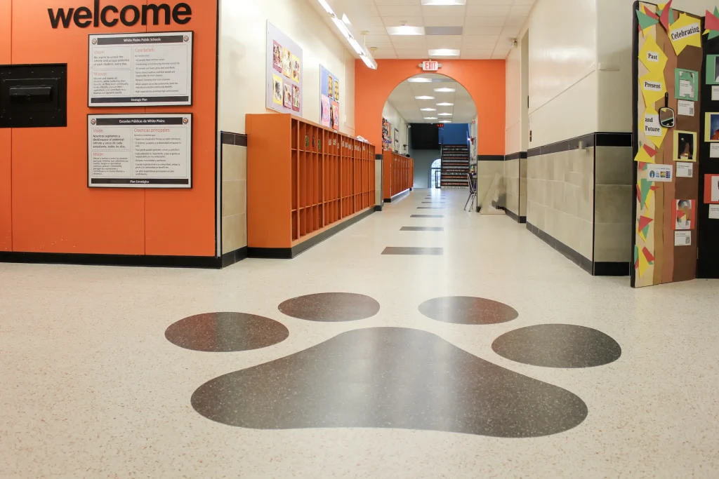 Mamaroneck Avenue School had 7,823 sq. ft. VET tiles installed over February break. Frank Stefanelli, the school’s Facility Director, determined the colors and design layout. The Paw water jet logo was installed in the school’s hallway, and the Superintendent’s office was completed with carpet tile last summer. Laserjet cuts were also made here to accommodate the space of this installation. The impression left by a custom logo in the floor installation is significant and effective for students and the community.