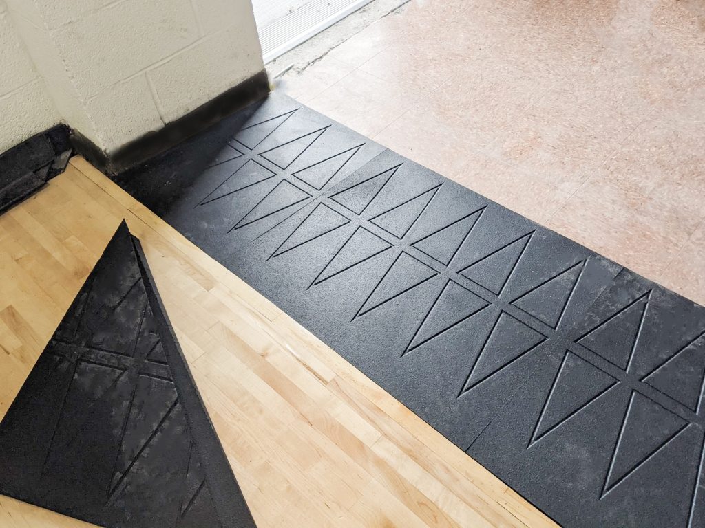 Cairo-Durham High School was scheduled for a routine sports flooring sand and refinish in the summer of 2022. A challenge arose when the school requested the replacement of old sharp metal ramps with something safer and more visually appealing. Milburn’s team came up with the solution to use CourtEdge™ Reducer Ramps by Safepath. CourtEdge™ Reducer Ramps are designed to remove vertical barriers and be affixed to the vertical sides of sports flooring, gyms, and other raised platforms that are in need of a smooth transition up from the subfloor. These ramps are made of rubber, so there are no sharp or hazardous edges. They are also ADA compliant making it handicap accessible with no weight limitations. In the high school, all four corners of the room had CourtEdge™ Reducer Ramps installed.Designed for interior and exterior applications, CourtEdge™ Reducers will not freeze, crack, or splinter. Milburn worked with RENU to rip up the old ramps and RENU’s skilled carpenters installed the new footing that the CourtEdge™ Ramp sits on to make it a seamless transition from the wood floor to the ramp. After this safe, durable, and aesthetically pleasing solution was installed, the wood flooring system was sanded and refinished with a newly painted logo.
